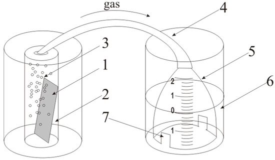 The sample (1) was placed into a glass cell with ethanol solution (2). Gas evolution (3) occurs. Then, gas follows on a flexible tube (4) in cell (5) located in glass cell (6) with water (level 0). Then the gas displaces water from cell through the holes (7) and the level changed. The displaced water volume equals to gas volume evolved during a certain time Vwater = Vgas.