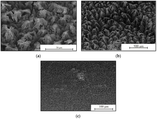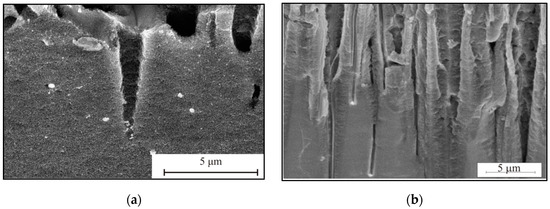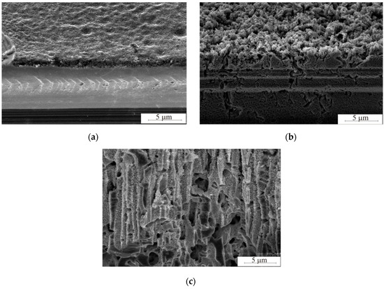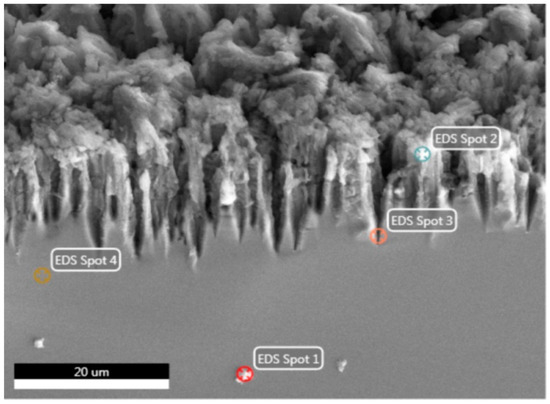 Figure 8, it can be seen that the gradual reduction of the gas evolution rate was due to contamination of the surface with reaction products. The higher the concentration of ethanol in the solution, the denser the precipitates. The thickness of the precipitate layer covering the porous layer has a value of several micrometres. The element analysis (EDX method) of the porous surface after EEO (