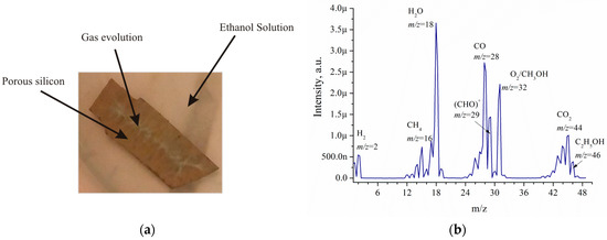 Figure 6a illustrates EEO. Intense gas evolution is observed from the functionalised metal-based silicon porous material immersed in ethanol solutions. Intense gas evolution gradually decreased. The gas evolution duration can be as long as several hours. The gas composition is shown in