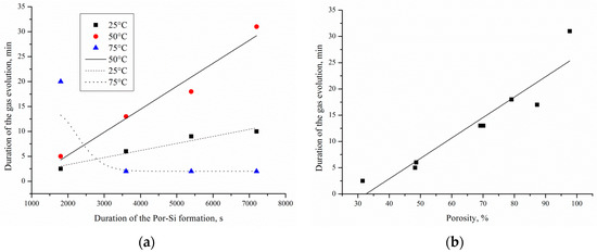 Figure 7a,b shows the influence of the sample porosity, etching duration and temperature on the duration of gas evolution. In this work, intensive gas evolution can be visually detected without using additional devices.