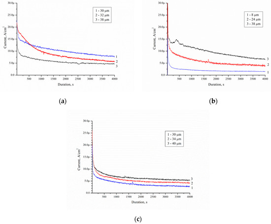 Figure 11 shows the mass activity as a function of time on the Pd/porous silicon with a different thickness of por-Si for the solution No. 1–3. The mass activity characterises the amount of ethanol that was oxidized by the sample over a period of time