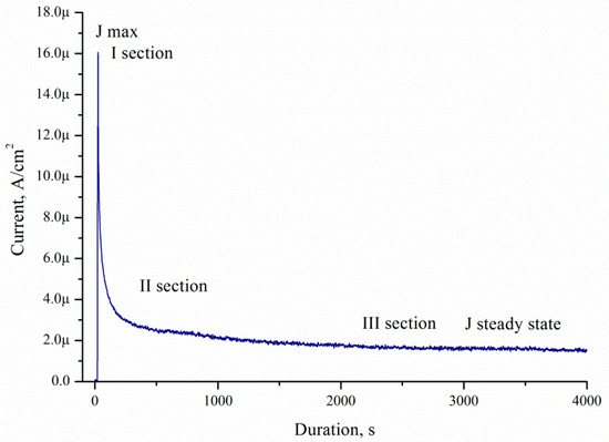 Figure 12). Then, the current decreased with time (II section). After a few minutes, the current achieved a pseudo-steady state (III section). The curve type corresponds to current–time curves measured during electrooxidation of dimethyl ether on Pt/C and PtMe/C catalysts in sulphuric acid [