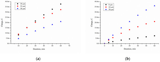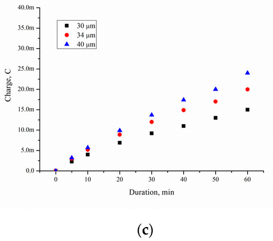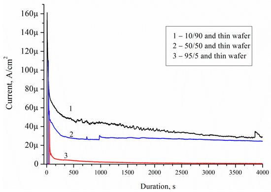 Figure 14 shows current–time curves measured on Pd/por-Si for different solutions at 25 °C. A decrease in the wafer thickness by 70 μm, with the same thickness of porous silicon 30 μm, increases the charge from 36 to 140 mC for solution 10/90, from 20 to 100 mC for solution 50/50, and from 14 to 72 mC for solution 95/5 at 3600 s oxidation.