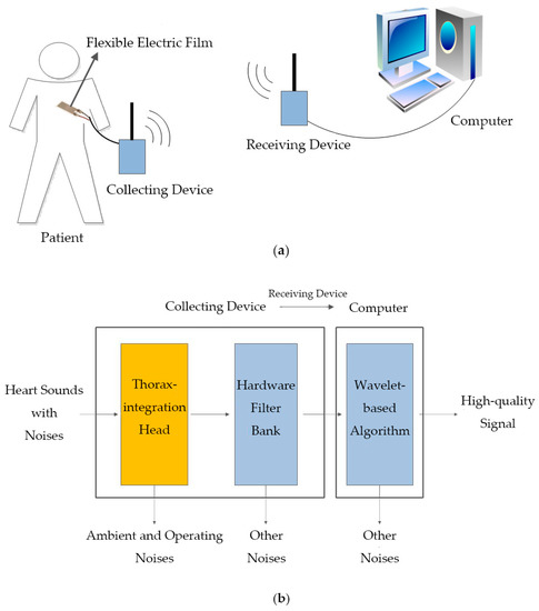Architecture of the low-noise-level heart sound system: (a) operational schematic diagram; (b) denoising procedure diagram.