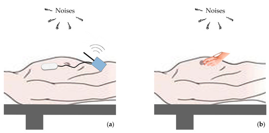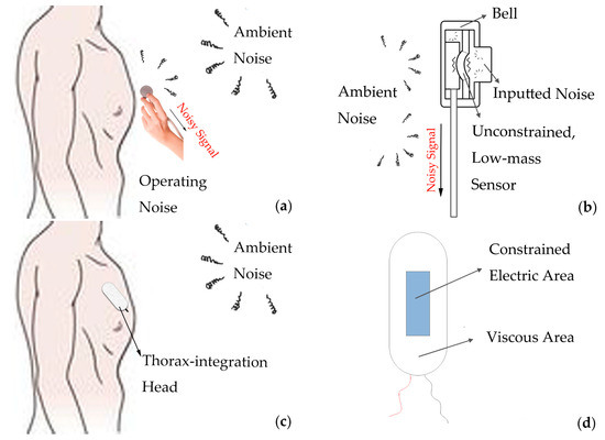 Firstly, we illustrate why heart sounds from traditional stethoscopes are noisy. On the one hand, due to its limited “Bell” structure, the stethoscope head has to be manually pressed on the thorax during detector operation, but this “unstable” contact probably results in operating noise caused by the diaphragm’s relevant motion with the thorax, clothes, or fingers (shown in Figure 2a). On the other hand, the low-mass sensor in the hollow-structure head is vibration-unconstrained, and the ambient noise with even a weak represented energy is always able to vibrate it to produce an undesired noisy signal (shown in Figure 2b).
