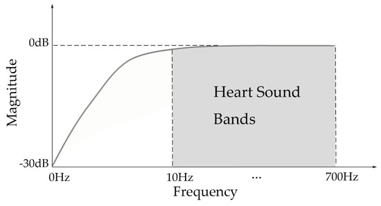Complementally, the high-sensitivity transformation area was piezoelectric. According to its frequent responses shown in Figure 3, the curve of the used sensor was flat and stable in the heart sound band (10–700 Hz as usual), which revealed the low distortion of the collected signals.