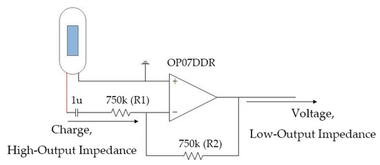 However, the hardware design of the piezo-based device was more complicated. A charge amplifier was applied to transform the high-output impedance of the piezoelectric sensor. Specifically, it is necessary to adjust values of the resistances (R1 and R2) to change the input impedance and gain, and to obtain a voltage signal with a low-output impedance to process further (shown in Figure 4).