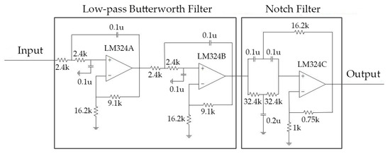 Further, a hardware filter bank (shown in Figure 5) was applied to remove other noise, which can be distinguished by frequency. Specifically, the signal was first input into a low-pass 4th order Butterworth filter to remove components out of the heart sound band. Then, a parallel-T RC notch filter was applied to inhibit the power-line frequency interferences.