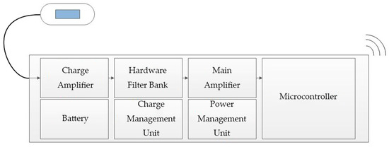 Five other modules were present in the collecting device (shown in Figure 6): a main amplifier was applied to enlarge the filtered signal. A microcontroller called CC2530 was applied to convert the analog signals to digital signals and implement wireless transmission. Meanwhile, the collecting device was supplied by a chargeable battery of 5 V and converted to ±3.3 V through the power management unit. All key electronic components used in the collecting device are shown in Table 1.