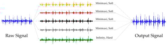 As it is shown in Figure 7, the raw signal was first decomposed with level 4 using the ’db10’ mother wavelet. The components of 5 frequency bands of 0–62.5, 62.5–125, 125–250, 250–500, and 500–1000 Hz were obtained. Further, as the last component was over the frequency band of heart sounds, the hard thresholding method with an infinite threshold was selected to eliminate this part. Then, the soft thresholding method with the minimax threshold was selected to denoise other components. Finally, we reconstructed the processed coefficient matrixes and obtained the output signal.