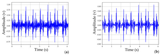 As for the quality of signals, it is evident that the fundamental components: S1, systole, S2, diastole, were completely recorded in the raw signal (shown in Figure 10a), but some noise was inevitably observed. However, the output (shown in Figure 10b) represented a much purer signal.