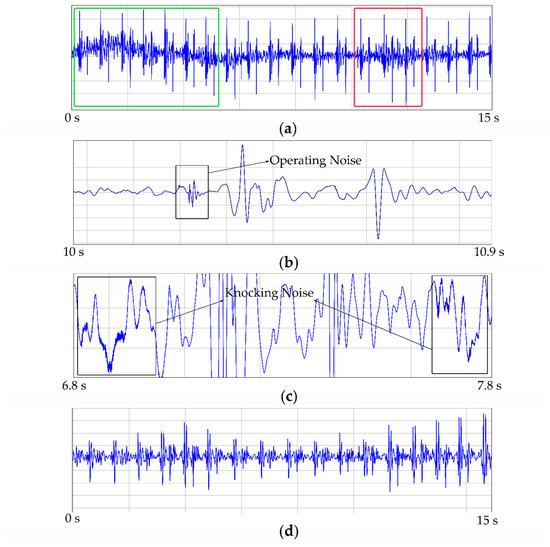 First, signals collected in the knocking environment were abstracted as an example to specifically analyze its components. Shown in Figure 11, the recording from the 3M stethoscope (shown in Figure 11a) represented an apparent baseline shift in the green frame. The operating noise might have been heard in the whole audio, especially strong in the red frame. This recording was extended for further analysis. We noticed that the operating noise (shown in Figure 11b) was similar to those of S1 and S2, causing an obstacle to the filter. Moreover, knocking noises also always appeared in the background (shown in Figure 11c) and it seems that a high-frequency wave was attached to the envelope of heart sounds. However, the recording from the proposed system (shown in Figure 11d) was much purer and more stable. Analogously, the recordings from the system also had similar characteristics to other kinds of noise tests (cheering, typing et al.).