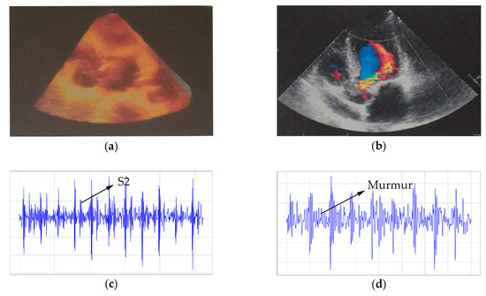 As far as pathological information, fundamental heart sounds (such as S1 and S2) were obvious in the normal recording shown in Figure 12c, while S2 replaced by murmurs was in the abnormal recording shown in Figure 11d. Their corresponding echocardiography maps are shown in Figure 12a,b. Furthermore, except for two uncertain items, the rest of the diagnoses were correct in the expert’s report.
