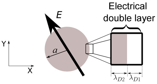 Since we are interested in the linear response (polarizability) of the particle–electrolyte system, we will assume that the applied signals are small and Equations (7) and (10) can be linearized. Under this assumption, and considering that the charge density in the electrolyte (medium ) is ), while in the particle (medium ) is ), the following equations apply [26,29]: