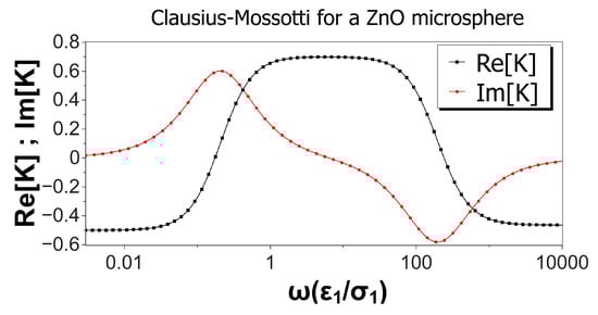 Figure 2 shows the real and imaginary parts of the Clausius–Mossotti factor versus nondimensional frequency for a ZnO microsphere immersed in a KCl solution. Values of the material properties are taken from Table 1, and the microsphere was 10 m in diameter. Thus, the nondimensional Debye length was . Interestingly, the real part of K was negative for low and high frequencies, predicting negative DEP for these two limits, while positive DEP was expected for intermediate frequencies. According to the Kramers–König relations, an increasing value for the real part of K implies a positive peak for the imaginary part, while a decreasing value in is accompanied by a negative peak in . This is the result shown in Figure 2 for the imaginary part of the Clausius–Mossotti factor, predicting counterfield rotation at low frequencies and cofield for higher frequencies. As mentioned above, numerical values for the DEP velocity can be calculated from Expression (5). Using a typical experimental value for as in [7], we obtained DEP velocities ranging from to 5.6 m/s for the 10 m ZnO microspheres. Likewise, using Expression (6) and a typical value of kV/m, the counterfield peak angular velocity for these spheres was around 3.4 rad/s and slightly lower for the cofield peak velocity.