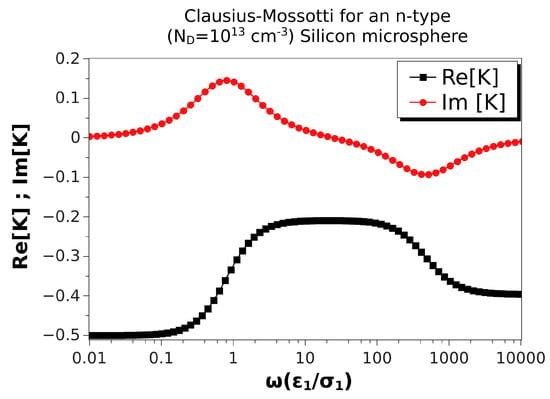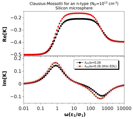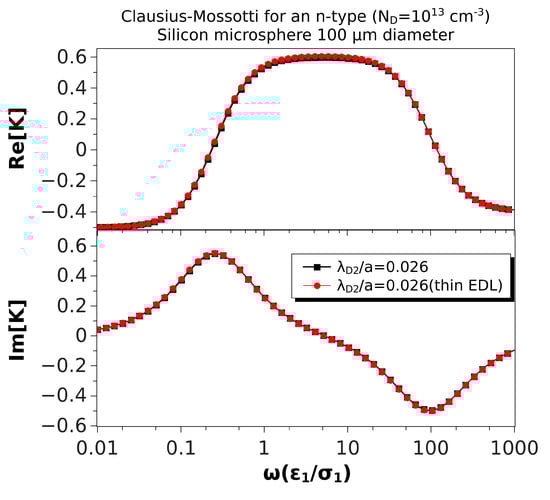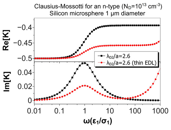 The system polarizability as given by Equation (28) is valid for any values of the two length scales in our physical problem: the sphere radius and the thickness of the electrical double layer (EDL) that is induced at the particle–electrolyte interface. For a semiconductor–electrolyte interface, the EDL can be described as the combination of two diffuse layers: one in the liquid side and the other in the solid particle. The thickness of the diffuse layers is given by the Debye length (), which decreases with the reciprocal of the square root of the charge carrier concentration, as shown above [35]. Typical values for the Debye length are 30 nm for an aqueous solution of KCl with a concentration M; and 40 nm for silicon with a doping density of [36]. Thus, in many experimental situations where the sphere radius is larger than a few microns, the EDL thickness will be much smaller than the particle size ().