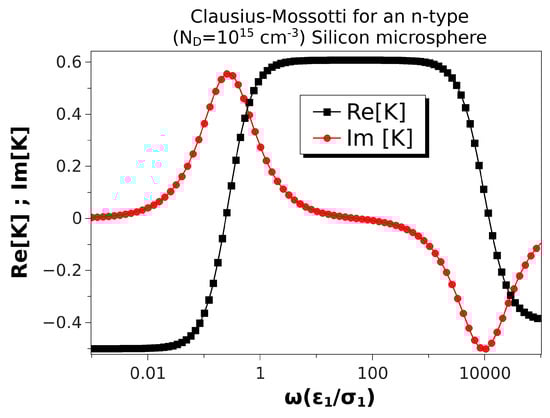 The values of the permittivities for the electrolyte and the semiconductor are taken as real numbers. This is a very good approximation for frequencies below the microwave region, i.e., below GHz. Interestingly, the maximum angular frequency in Figure 2, Figure 3, Figure 4, Figure 5, Figure 6 and Figure 7 is 10,000-times the reciprocal of the charge relaxation time in the electrolyte, , i.e., around 2.1 MHz for an aqueous electrolyte with 1.5 mS/m. This means that our theoretical model is evaluated for a maximum dimensional frequency of around 3.4 GHz, already in the microwave region. Thus, the imaginary part of the permittivity could have some influence within the high-frequency range of the Clausius–Mossotti factor, but we do not expect any qualitative difference with the present results.