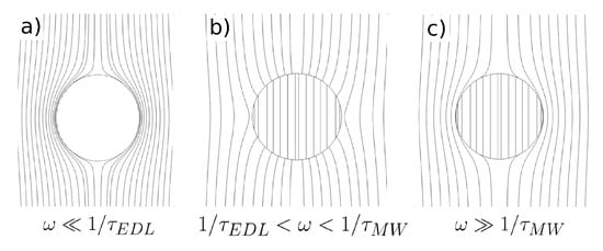 Figure 8. Electric field lines for a semiconducting particle immersed in an electrolyte: (a) Signal frequencies much smaller than the reciprocal of the double layer charging time (); (b) intermediate frequencies; (c) frequencies much higher than the reciprocal of the Maxwell–Wagner characteristic time (). - As the signal frequency increases, there is not sufficient time for complete charging of the EDL by the electrical currents coming from the liquid bulk. The real part of the Clausius–Mossotti factor increases, leading to a weaker negative DEP and, eventually, to positive DEP behavior if the sphere conductivity is high enough; see Figure 8b.