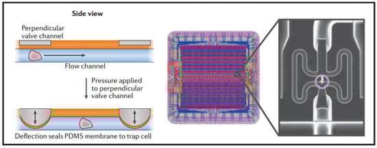 | Micro-valve [60] | Reliable and fast for control, suitable for large-scale integration | Require complex and cumbersome external control devices | 96 cells/chip | 90.6 ± 8% | -- | |