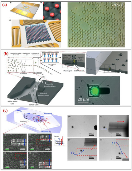 - Shields, C.W.; Wang, J.L.; Ohiri, K.A.; Essoyan, E.D.; Yellen, B.B.; Armstrong, A.J.; López, G.P. Magnetic separation of acoustically focused cancer cells from blood for magnetographic templating and analysis. Lab Chip 2016, 16, 3833–3844. [Google Scholar] [CrossRef] [PubMed]
