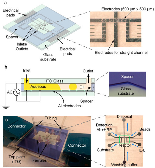 Although microfluidic devices significantly reduce the required sample volume in the immunoassay, it still is not the most desirable solution in certain circumstances. For example, in a neonatal intensive care unit (ICU), the necessity of frequent withdrawal of even a few mL of blood from neonates for disease diagnostics and monitoring can lead to severe blood loss and the need for blood transfusion [11]. This is especially the case where multiple disease markers need to be measured and monitored frequently for personalized intervention in a timely fashion. Digital microfluidics (DMF) [17,18,19] can offer an attractive alternative, and the technique is gaining attention due to its ability to handle nL to pL discrete sample droplets in a programmable fashion. Ultimately, DMF can better support low-sample-volume immunoassay applications to monitor disease markers with largely reduced blood draw volume each time.