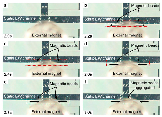 The merging of a droplet of magnetic beads into a static electrowetting channel. (a) A static electrowetting channel was formed. A magnet was placed on the top of the device over a droplet of magnetic beads (not shown). (b,c) The droplet of magnetic beads was merged into the channel, and the beads migrated for ~1 mm both upstream and downstream. (d,e) The beads were attracted by the magnet and migrated in the reverse directions. (f) The beads were aggregated on the electrode under the edge of the magnet.