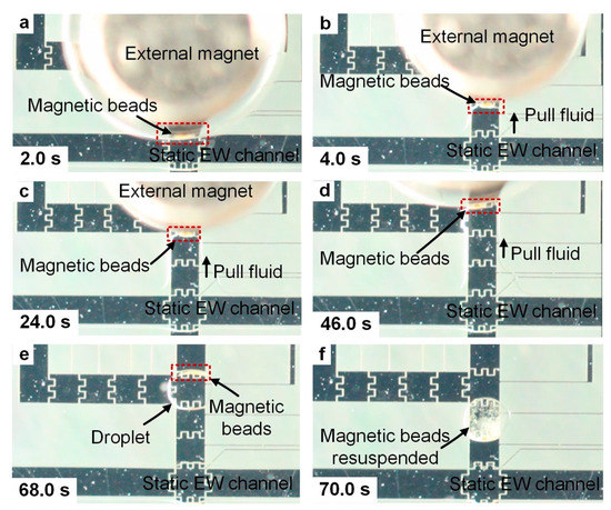Likewise, after washing, before splitting the droplet of beads from the channel, the flow should be stopped to avoid the loss of beads during this process (Figure 5a). Side electrodes were then activated to direct the fluid out of the channel, and the magnet was then slowly moved in the direction that the fluid was pulled out to ensure that the magnetic beads were still aggregated before a droplet of beads was separated from the channel (Figure 5b–d). The splitting electrode was then turned off and a droplet of magnetic beads was split from the channel. The magnet was removed after the droplet was split, but the beads were still aggregated (Figure 5e). After the droplet was agitated, the beads were then re-suspended in the droplet of washing buffer solution, and were ready to be used for the subsequent processing.