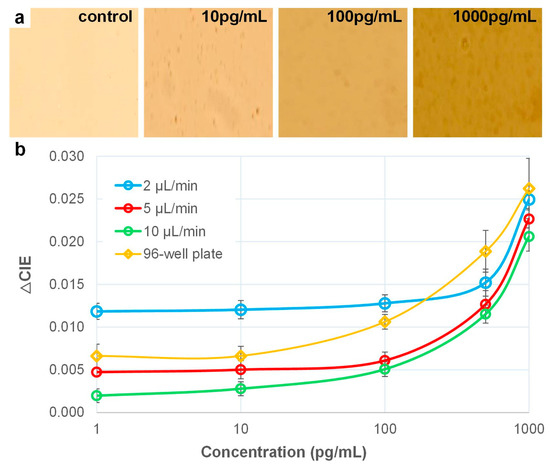 It was possible to distinguish the difference in the color in all five concentrations with the naked eye looking through the microscopic objective. However, capturing images which quantify the signal strength remains a challenge. The ambient lighting conditions and camera parameters were carefully set and tuned to ensure uniform lighting. It would be more desirable to image all five samples on a single frame to ensure uniform lighting to obtain reproducible results. The images were analyzed using the CIE color space, where the difference of colors is represented by a difference in value, that is, ∆CIE. The shift toward the yellower region in the color space indicates a higher concentration of IL-6 molecules. Hence, the concentration measurements are relative to each other. The LOD for human IL-6 reached 10 pg/mL, even though the droplet volume of IL-6 was reduced to ~60 nL. As a comparison, the standard 96-well plate ELISA using the same colorimetric detection approach was performed for comparison. Both sets of results are shown in Figure 6b.