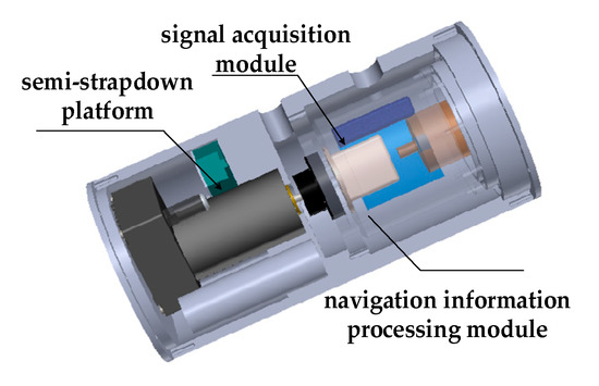 Above all, we still choose the MEMS-IMU (MIMU) to measure the velocity, position, and attitude information. To solve the contradiction between high range and high precision, the concept of semi-strapdown inertial navigation system (SSINS) was proposed by the Key Laboratory of Instrumentation Science and Dynamic Measurement [11]. The structure of the system is shown as Figure 1, which is mainly composed of semi-strapdown platform, signal acquisition module, and navigation information processing module.