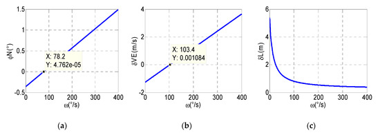 (a) The relationship curve of north attitude error and modulation angular rate. (b) The relationship curve of east velocity error and modulation angular rate. (c) The relationship curve of latitude error and modulation angular rate.