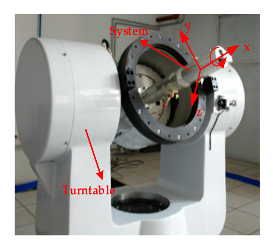 The RSSINS is installed on the high-precision three-axis flight simulator as shown in Figure 5, which is used to simulate the carrier’s attitude change. With the sensitive axes of MIMU defined as the x-axis pointing forward, the z-axis pointing right, and the y-axis pointing up, the rotation of the inner frame rotates the system about its x-axis.