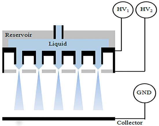 - Bocanegra, R.; Galan, D.; Marquez, M.; Loscertales, I.G.; Barrero, A. Multiple electrosprays emitted from an array of holes. J. Aerosol. Sci. 2005, 36, 1387–1399. [Google Scholar] [CrossRef]