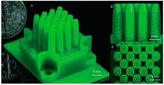 Unlike uniaxial electrospraying, there have been few studies about microarray sources for coaxial electrospray. As we know, research about MEMS multiplexed coaxial electrospray was reported in 2016 [36]. Core-shell particle generators with up to 25 coaxial ejection emitters (25 emitters cm−2) were 3D-printed using stereolithography (Figure 3).