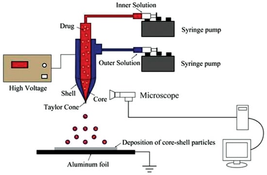 Although the single-capillary electrostatic spraying method exhibits specific advantages, there are still some limitations for preparing drug-loaded polymeric particles utilizing this strategy. During the process of spraying the drug-polymer mixture, the phenomenon of initial burst release is usually observed because of the surface/near-surface drug loading [4,5,6,7]. In the process of ejecting liquid onto the receiver, drugs are present on the surface and inside the particles when the solvent is completely volatilized. Drugs that stay on the surface of the carrier via physical adsorption and adhesion may easily cause drug release phenomenon [8]. Preparing drug-loaded particles with a core-shell structure is an appropriate way to introduce drugs directly into the core layer of the particles. Meanwhile, the shell polymer can protect the drugs in the nuclear layer to a certain extent. When these drug-loaded particles are intravenously injected into the human body, drugs can be released slowly from the nuclear layer with the continuous degradation of the shell material. Therefore, this strategy can effectively overcome sudden drug release behavior, solving the problem of ordinary electrostatic spray particles., Coaxial electrohydrodynamic atomization (CEHDA) provides a promising technology for achieving drug-loaded particles with a core-shell structure, and has attracted tremendous interest from researchers in recent years [9,10,11,12,13,14,15,16,17,18].