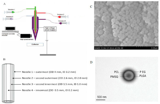 Schematic illustration of (A) the experimental set-up of the EHD process using a four-needle device for forming four-layer structures with a stable jet (inset); (B) the coaxial needle arrangement with labeled dimensions, where ID and OD are internal and outer diameters, respectively; (C) SEM image of four-layered particles at low magnification; (D) bright-field TEM image of a particle showing four distinct layers (Adapted from [64]).