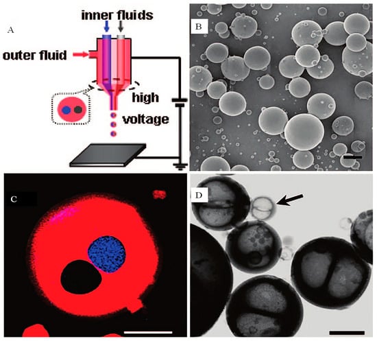 - Loscertales, I.G.; Barrero, A.; Guerrero, I.; Cortijo, R.; Marquez, M.; Ganan-Calvo, A.M. Micro/nano encapsulation via electrified coaxial liquid jets. Science 2002, 295, 1695–1698. [Google Scholar] [CrossRef] [PubMed]