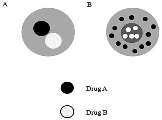 A brief comparison of the structure of (A) multi-compartment microparticles, and (B) multilayered microparticles loaded with multiple drugs at the same time (Adapted from [84]).