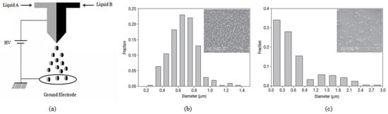 In addition, CEHDA technology also exhibited its outstanding performance for preparing chemical drug-loaded particles [48]. Budesonide and water-soluble polyphenols were encapsulated in monodisperse and uniformly-sized poly(lactic-co-glycolic acid) (PLGA) nanoparticles, respectively. The obtained particle sizes ranged from 165 nm to 1.2 μm. The results indicated that the application of CEHDA was not limited to drug solubility. Furthermore, the mechanism of releasing the nanoparticles was studied. It was observed that the drug release rate decreased as the nanoparticle size increased. The initial drug release behavior of these sub-micron particles prepared using the dual-capillary electrospray method was mainly due to water permeation and drug diffusion, rather than PLGA degradation. In comparison with conventional strategies, the electrospray method exhibited specific advantages for developing drug-loaded particles. Since the core-shell structure of the particles could prevent the drugs from being absorbed on the surface of the particles and/or encapsulated near the surface of the particles, the drugs had minimal or no initial burst release. Complete drug release was obtained due to no polyvinyl alcohol (PVA) being involved in the electrospray process. Researchers also found the diameter of drug-loaded polymer particles could be adjusted by controlling the concentration and electrical conductivity of PLGA solutions. New methods were investigated to tune the size of drug-loaded nanoparticles for meeting different requirements.
