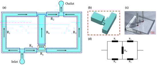 According to the equivalent circuit of the microfluidic Wheatstone bridge (Figure 1d), the flow rate through the bridge channel can be given by: