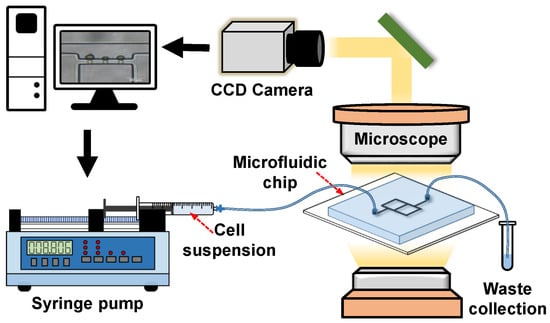 For the operation of the microfluidic micropipette aspiration device (see Figure 2), the inlet was connected to a syringe pump (Pump 11 Elite, Harvard Apparatus, MA, USA) filled with the cell suspension. During the cell trapping, the cell suspension was pumped at the volume flow rate increased from 20 L/h to 120 L/h at a step of 10 L/h. In each case, we waited at least 1 min to observe the cell deformation. Images of cell deformation were captured only when the cell maintained its shape for at least 1 min (i.e., the stable state). The cell deformation due to the micropipette aspiration was observed under an optical microscope (CKX41, Olympus, Tokyo, Japan) with a CCD camera. The recorded images were further applied to measure the mechanical properties of single cells.