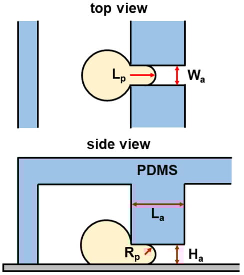 In general, the two most popular models for analyzing single-cell mechanics treat the cell either as a homogeneous elastic solid or a drop of liquid encapsulated by an elastic solid shell []. Here, we adopt the elastic solid model of Theret et al. []. Figure 3 presents a schematic diagram of a spherical cell aspirated into an MPA channel. The Young’s modulus of single cells to pressure is thus expressed as: