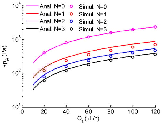 Comparison between analytical (solid lines) and simulation (circle markers) results of the pressure difference across the micropipette aspiration channel versus the total flow rate. N is the number of open aspiration channels.