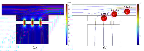 (a) Velocity distribution and streamlines around the micropipette aspiration channels for N = 3. (b) Tracking trajectory of a particle at different time intervals.