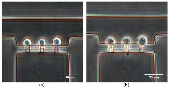 The microfluidic MPA device based on the principle of the Wheatstone bridge consists of a polydimethylsiloxane (PDMS)–glass chip fabricated by standard soft-lithography techniques (Figure 1c). The microchannels were patterned in PDMS (Sylgard 184, Dow Corning, Midland, MI, USA) by replica molding. The mold was prepared by spin-coating a thin layer of negative photoresist (SU8-2050, MicroChem, Newton, MA, USA) onto silicon wafers polished on one side (111 N-type, Lijing Ltd., Quzhou, China) and patterned with UV mask aligner (URE-2000/35, Chinese Academy of Sciences, Beijing, China). Next, the micro-channel layer was obtained by pouring PDMS with 10:1 (w/w) base:crosslinker ratio onto the mold, yielding a thickness of approximately 3 mm. After curing the elastomer for 2 h at 80 C, the PDMS slab was peeled from the mold, punched, and hermetically bonded to a coverslip by plasma oxidation. In our device, all the microchannels consist of rectangular cross sections. According to the requirements in Equations (6) and (7), the dimensions of microchannels were determined as shown in Table 1.