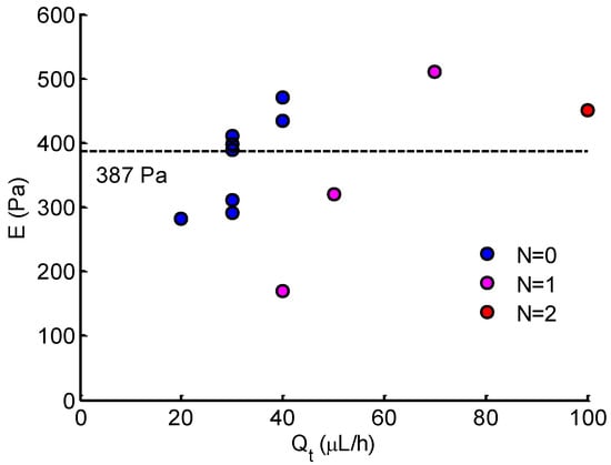 The Young’s modulus of Hela cells was evaluated for solid-like cells at the stable state. The results are shown in Figure 9. The average Young’s modulus of Hela cells was 387 ± 77 Pa. This value is comparable to previous studies using magnetic tweezer [] or micropipette aspiration technique [], but it differs with that measured by atomic force microscopy [,,,,]. It is clear that most measurements were at low flow rate (20–40 L/h), where the aspiration pressure is low. As increased, only four measurements included one or two open micropipette channels ( or ), indicating a relatively higher Young’s modulus than those at low flow rates.