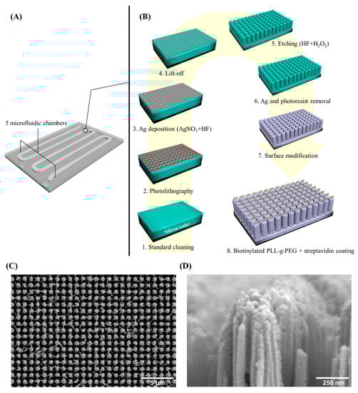 The silicon-based microfluidic Coral Chip. (A) An exemplified Coral Chip with 5 microfluidic chambers. (B) The manufacturing follow chart of the Coral Chip chamber surface: 1. standard cleaning, 2. photolithography, 3. Ag deposition, 4. liftoff, 5. etching, 6. Ag and photoresist removal, 7. surface modification, and 8. biotinylated PLL-g-PEG + streptavidin coating. (C) Top view and (D) lateral view of a scanning electron microscope (SEM) image of the Coral Chip.
