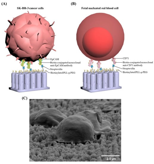 Rare cell captures by the Coral Chip: The Coral Chip surface is coated with biotinylated PLL-g-PEG + streptavidin, and the potential targeted cells are pre-labeled with biotinylated antibodies. The strong interaction between streptavidin and biotin enhances the capturing effect. (A) A schematic diagram of the SK-BR-3 cancer cells captured from an artificial cell mixture with a large amount of Jurkat cells as the background. (B) A schematic diagram of the fetal nucleated red blood cells (fnRBCs) captured from the peripheral blood of pregnant women. (C) Scanning electron microscope (SEM) micrographs of the targeted cells captured on Coral Chip.