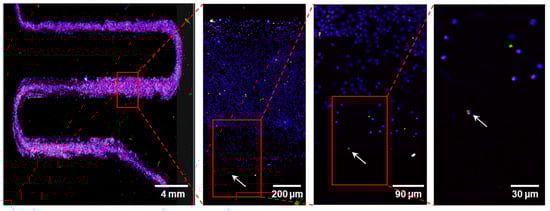 In every 2 mL of the maternal blood being tested on 1 Coral Chip, the circulating fnRBCs were always captured in all the 14 pregnant women examined (Table 2). The fnRBCs were enriched on the chip (Figure 4) and identified based on the count-in/filter-out criteria of CD71+/GPA+/CD45−/Hoechst+ by a fluorescence microscope equipped with a built-in automated inspection and image analysis system (Figure 5). The cells automatically captured by system were rechecked manually. All the captured cells passed the count-in/filter-out criteria of fnRBCs, suggesting a low false capture rate. The number of captured fnRBCs were 2–71 cells per 2 mL of maternal blood. The total numbers of fnRBCs captured were 273 cells. As a result, the overall capture rate is estimated as 9.75 fnRBCs per ml maternal blood per individual (Table 2).