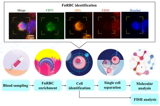 The process flow diagram of a cell-based noninvasive prenatal diagnosis (cbNIPD) by the fetal nucleated red blood cells (fnRBCs) enrichment strategy. The fnRBCs were identified based on the count-in/filter-out criteria of CD71+/GPA+/CD45−/Hoechst+.