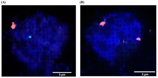 The fluorescent in situ hybridization (FISH) for cells on a Coral Chip. The cells are from the blood of a pregnant women with an euploid male fetus (case 13 in Table 2). The FISH was directly performed on the chip using the CEP X SpectrumOrange/Y SpectrumGreen DNA probe kit (Vysis, Downers Grove, IL, USA). (A) The fetal nucleated red blood cell (fnRBC) can be distinguished from (B) the maternal white blood cell (WBC) by the signals of chromosome X and Y: the fnRBC has 1 orange and 1 green signal, and the maternal WBC has 2 orange signals.